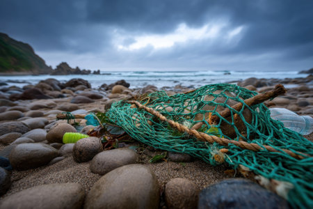 a fishing net entangled with plastic bottles washed onto a rocky beach, cloudy sky and moody coastal tones v 7, Generative AI
