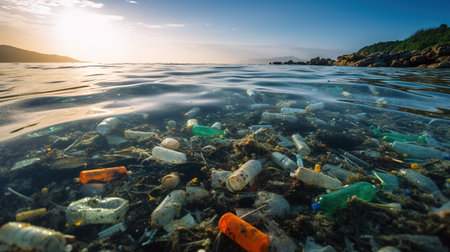 A stunning view of ocean water illuminated by sunlight, showcasing floating plastic debris that highlights the pollution issue affecting marine environments.