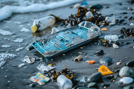 Colorful plastic garbage polluting a beautiful sandy beach with an incoming tide washing more debris ashore, highlighting environmental damage and the urgent need for sustainability