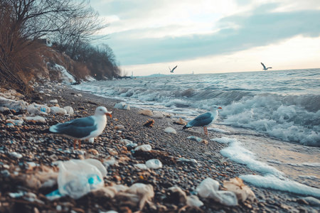 Seagulls standing on a beach strewn with plastic garbage, highlighting the global issue of pollution