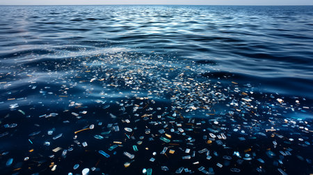 Bright plastic waste is scattered across the surface of a deep blue ocean, showing the pressing issue of environmental pollution.