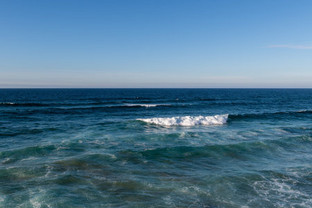 Outdoors showing deep blue ocean waves crashing under a clear sky keywords: ocean, sea, water, waves, ocean waves, sea waves, crashing waves, ocean surface, sea surface, blue, deep blue, clear...
