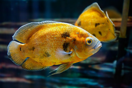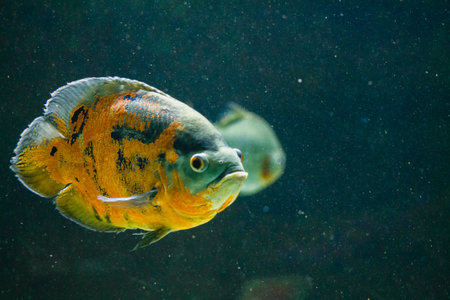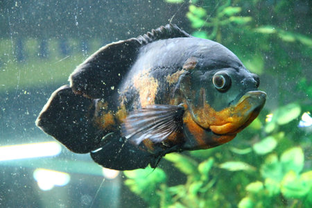 Oscar Fish in dark aquarium water. South America river fish Astronotus ocellatus.