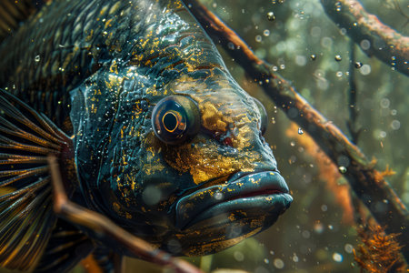 The terrible fish with eyebrows is floating among the seaweed in dark water