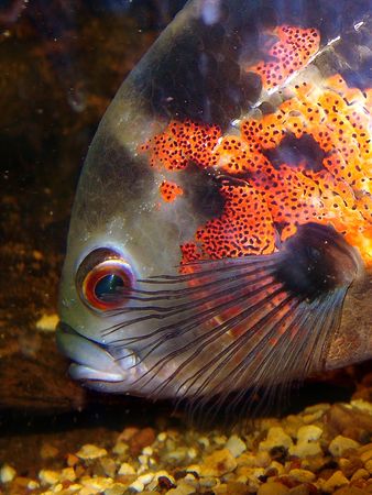 a portrait of the Ocellated Astronotus fish that swims underwater