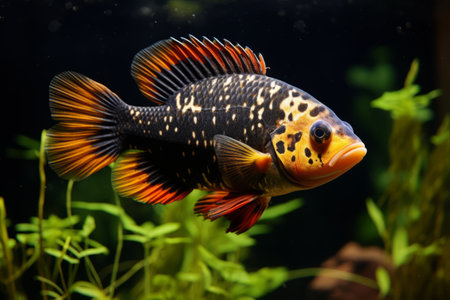 Side view of an Oscar fish with black and yellow markings swimming in an aquarium, with plants and bubbles in the background. High quality photo