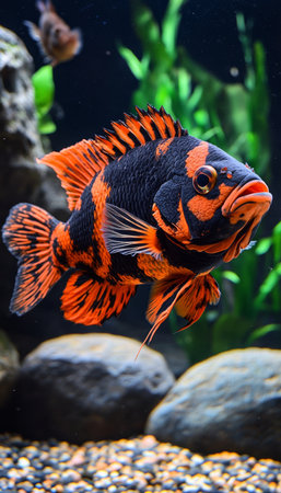 Curious Oscar Fish Observing Camera from Mid Tank Position Captivating Aquarium Life