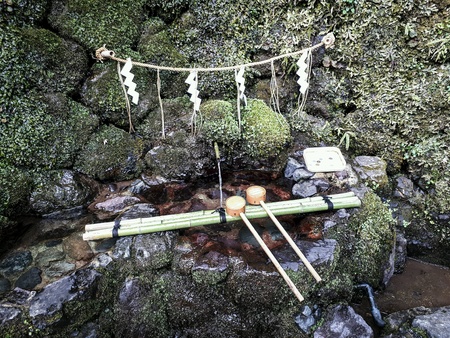 Japanese ladles at Shinto temple in Kyoto, Japan. In Japan, a tsukubai is a washbasin provided at the entrance to holy places for visitors to purify themselves.