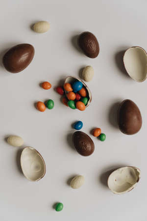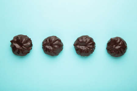 Different kinds of chocolates on colored table close-up. Top View and Flat Lay.
