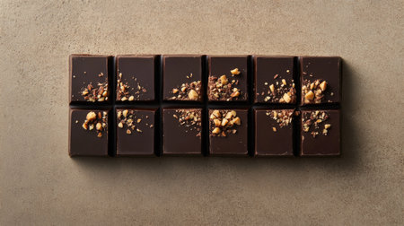 A top-down view of dark chocolate squares with crushed nuts, arranged in a row on a neutral background.