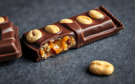 A broken chocolate bar with caramel and nuts sits on a dark surface