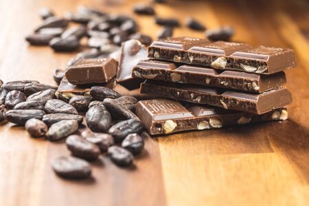 nuts and pieces of chocolate on wooden background. delicious chocolate bars with almond and hazelnuts on a brown background. Sweet food