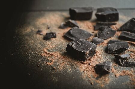 Pieces of tasty black chocolate on a black paper background. Sweet and calorie food. top view. copy space