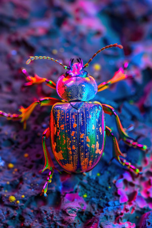 Neon lit beetle on psychedelic ground, vivid colors, fantasy insect.