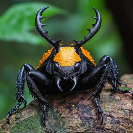 A vibrant black and orange rhinoceros beetle perches on a tree branch amid the dense greenery of a tropical forest. The beetles remarkable features including its prominent horns and textured body highlight its striking appearance