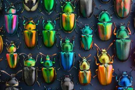 This striking image captures a collection of colorful beetles, showcasing their unique patterns and vibrant hues against a sleek black background. Ideal for educational or artistic purposes.