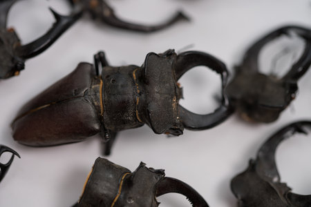 Stag beetles black and white. Duel of two males. close up.