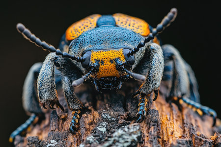A colorful beetle explores the rough surface of a tree bark, showing its intricate patterns and details, highlighting the beauty of nature in a forest setting.