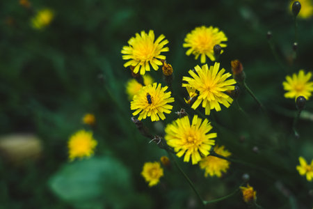 A fly is sitting on a dandelion. Yellow Dandelion Plantation