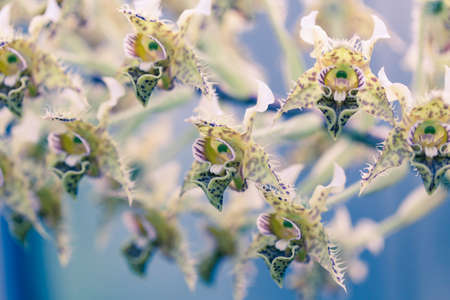 Beautiful closeup of an orchid White Oncidium Twinkle mini orchid. Selective focus