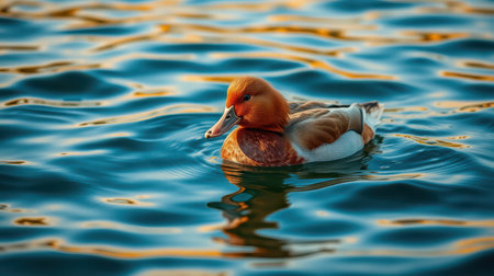 Beautiful duck swimming gracefully in a shimmering lake during sunset