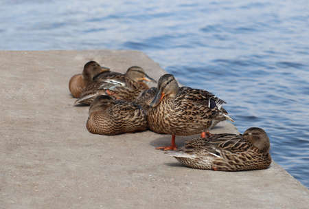 Duck and her grown up resting ducklings on the pier on a lake in summer