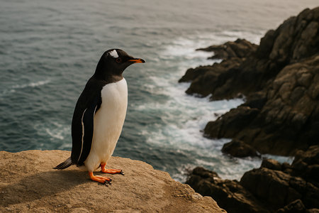 Gentoo penguin observes the vast, turbulent ocean from a rugged coastal cliff edge, showcasing wild marine life in its natural habitat.