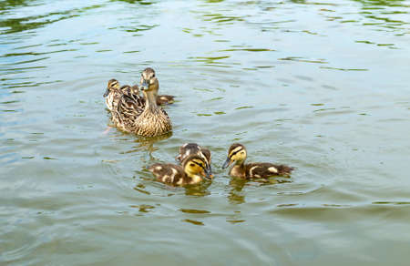 Mallard duck with ducklings on the lake, close up