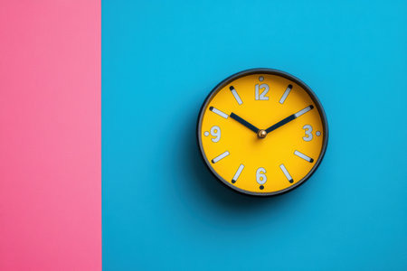 A vibrant yellow clock displays the time clearly on a striking blue and pink backdrop, creating a playful visual contrast in decor.