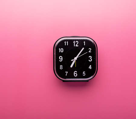 Analog alarm clock on pink background emphasizes time awareness, punctuality, and the visual impact of minimalist design.