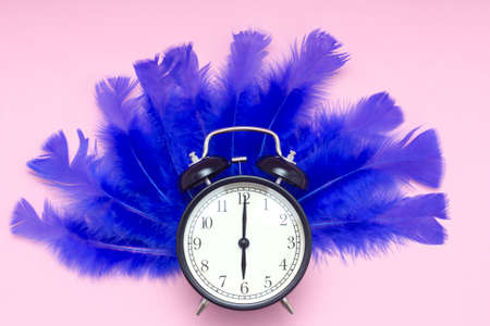 A black alarm clock lies on ratty blue feathers. pink background. Good morning concept. Comfortable waking up. Soft sleep.