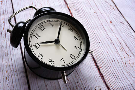 close-up black alarm clock on a white wooden background. Lost time concept. Business idea. Lifestyle
