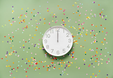 White watch at 12 oclock on light green glitter background. Top view. New Year celebration concept
