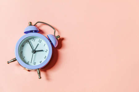 Blue alarm clock on a blue background. Shot from above. Space for text. Copy space