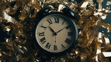 An elegant vintage alarm clock nestled in sparkling golden confetti, perfect for celebrating special moments and countdowns. Ideal for festive themes.