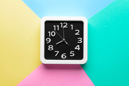 Blue clock on color background, top view.