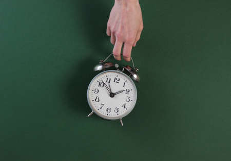 Female hands hold retro alarm clock on green background