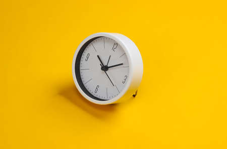 White clock on yellow background. Minimalistic studio shot.