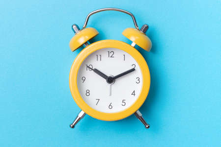 Yellow alarm clock on a blue background close up, top view