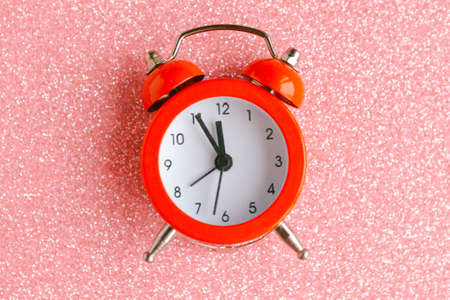 Alarm clock on pink glitter background. Minimal concept