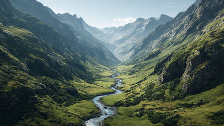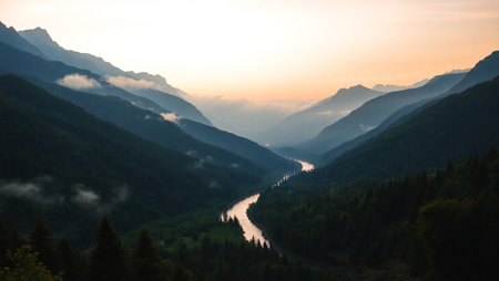 Sunrise illuminates a breathtaking mountain valley. Serene landscape.