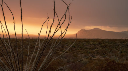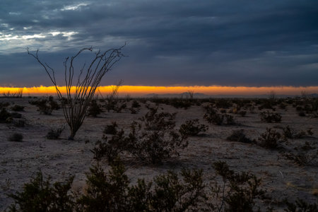 Green, leafing Ocotillo plant cactus at sunset. Taken in Joshua Tree National Park in California, at the Ocotillo Patch area