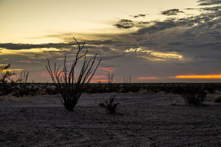 Dead Ocotillo cactus plant lying on the ground at the Ocotillo Patch in Joshua Tree National Park in California at sunset