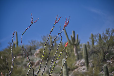 Saguaro Cactus and Ocotillo with colorful blooms in Saguaro National Park