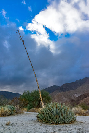 Large Agave with a dry peduncle with seeds against the background of a cloudy sky, State park ANZA-BORREGO DESERT, California