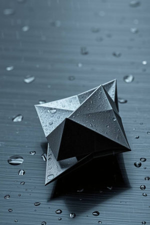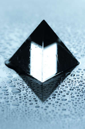 Close up image of a wet glass pyramid. Shiny pyramid with drops of water.