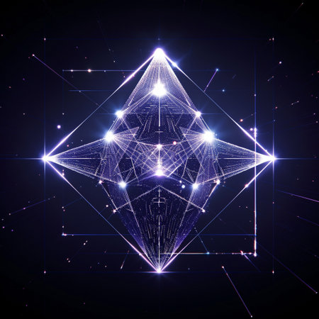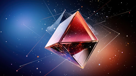 Stunning abstract geometric shape resembling a pyramid emerges in a vibrant cosmic landscape filled with stars and light, capturing the essence of creativity.