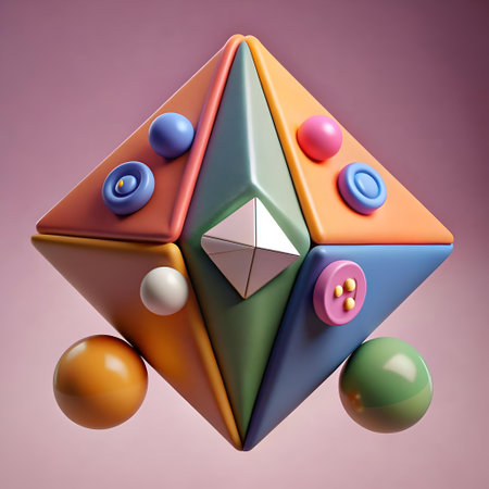 A playful. abstract 3D illustration featuring a geometric shape composed of vibrant colored panels. Ideal for branding. marketing. and design projects seeking a fun. whimsical aesthetic.
