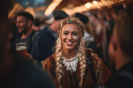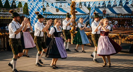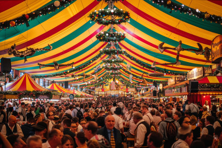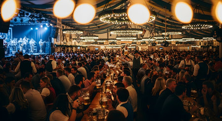 Immerse yourself in the lively atmosphere of a vibrant Oktoberfest celebration, as people joyfully dance and sing along to the energetic music in the bustling beer hall. Feel the excitement and embrace the spirit of this lively event