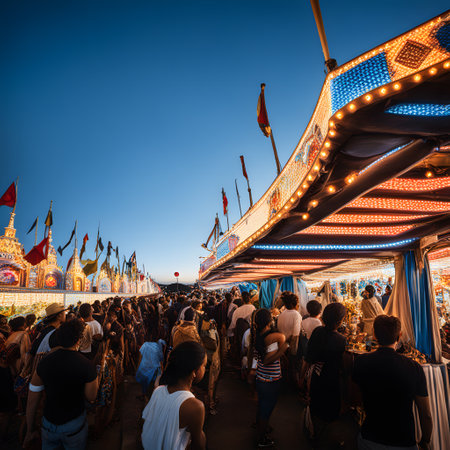 Vibrant and magical carnival atmosphere with blurred bokeh effect illuminating the night sky